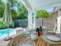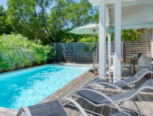 Villa du Lac, built in 2014. In the hamlet Les Bainasses 5 km from the centre of Lacanau-Ville, 7 km from the centre of Lacanau-Océan, 52 km from the centre of Bordeaux, 100 m from the lake, 7 km from the beach, in a cul-de-sac. Private: well-kept garden 300 m2 (fenced) with wildlife garden, swimming pool (7 x 3 m, seasonal availability: 26.Apr. - 27.Sep.) with alarm system. Outdoor shower, terrace, parking (for 2 cars) at the house on the premises. Shop 5 km, bus stop Le huga 4 km, sandy beach Lacanau-Océan 7 km, bathing lake Etang de Lacanau 400 m. Golf course (18 hole) 4 km.